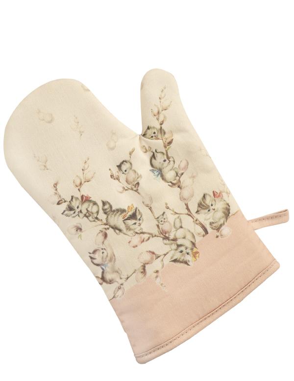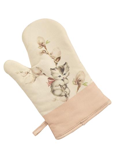 Nostalgic imagery of fluffy kittens seeking refuge amidst the catkins of a flowering willow branch adorn a sturdy oven mitt designed to spare hands from the hazards of hot ovens and stovetops. Pussy willow kittens such as these are common characters in an